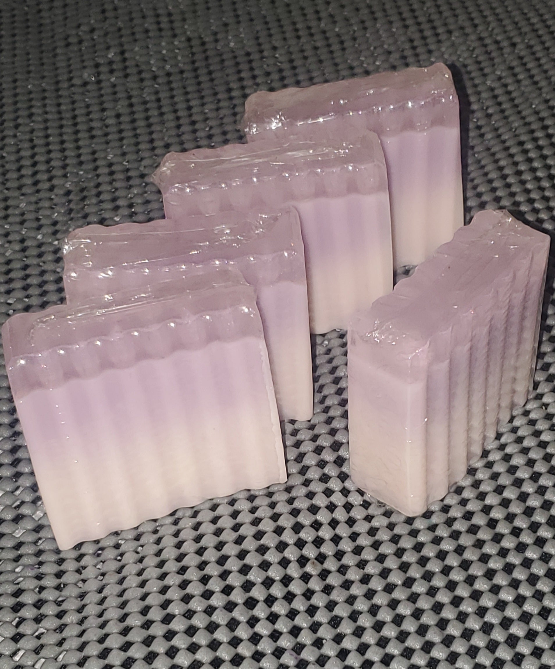 Each bar features a soft velvet-purple base with a translucent glycerin top, creating a luxurious, spa-inspired look that shimmers under the light.